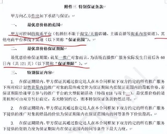 但随后事件愈演愈烈,一份美one和品牌方的协议在网络流传出来,该协议称:美one要求品牌方在指定范围内给予最大的促销力度,最优惠价格的范围为淘系平台(包括但不限于淘宝/天猫店铺、主播直播等淘系内容渠道)、其他电商平台和线下渠道。如若违约,品牌商需要向消费者退还五倍差价,并向美one赔偿违约金。